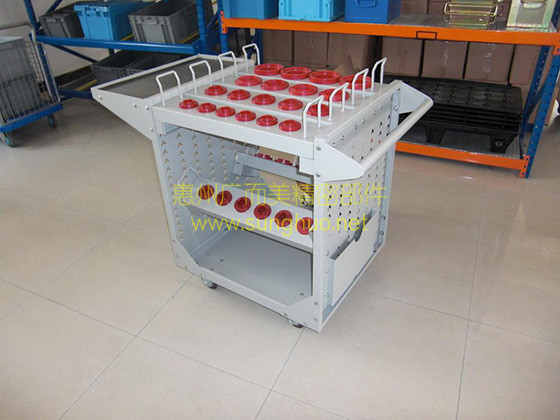适用于加工车间、维修车间等场合,可分类放置刀具,并可灵活移动方便取用。 现代货架厂生产的HY-HSK系列刀具车成多边成型的前后侧板上有模数化的人字孔,可将刀具座挂板按水平或15、30倾斜放置,方便多种刀具的存放。 高强度脚轮,车前为两个定向轮,车后为两个万向带刹车轮,推行平稳,方向性好,刹车固定后不会滑动。