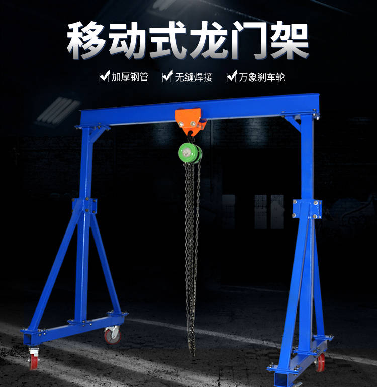 该移动龙门架最大的优点是可全方位移动性,可快速拆卸安装,占地面积小,用微型汽车就可转移到另一个场地安装使用。宽度、高度可分级调节,钢架构设计合理,能承受从100~5000KG重量。尤其适用于车间设备的安装、搬运、调试。汽车上货物的装卸,汽修车间吊装发动机大件等。起重小龙门架主要有二种规格:一是在地面上全方位移动的龙门架,带刹车承重轮可在地面上移动,适合在地面上起吊物品;二是用钢轨固定安装在楼板面或梁上,通过电动或人力葫芦,实现起重机械化。可减少人力,降低生产运营成本,提高工作效率。